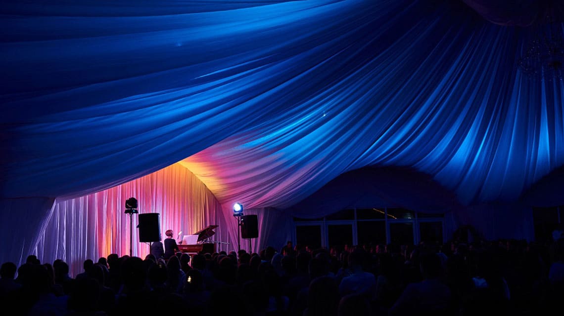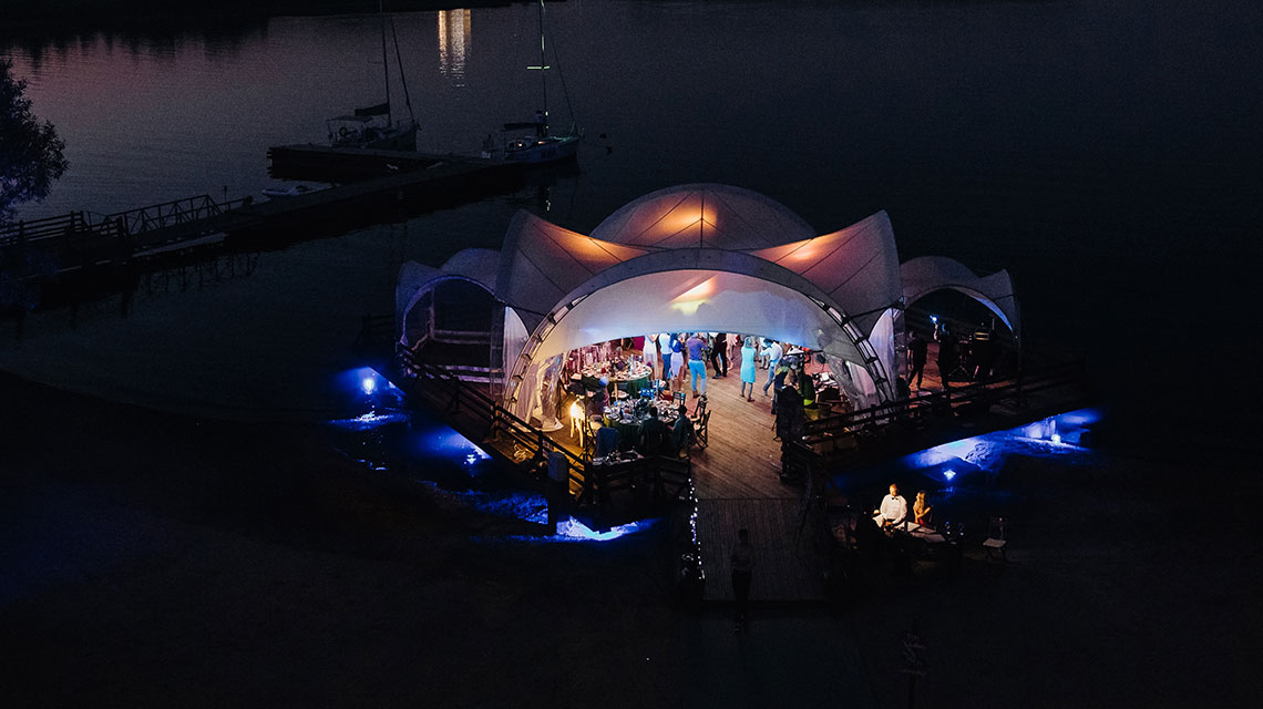 Tapahtuman unohtumattoman tunnelman ja hetken juhlallisuuden luomiseksi suosittelemme paviljongin varustamista erityisellä näyttämövalaistuksella.