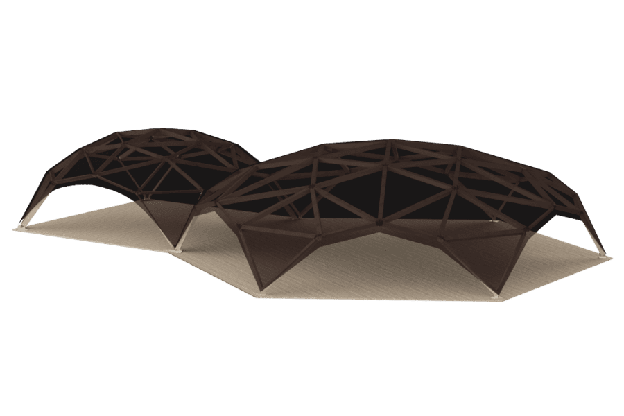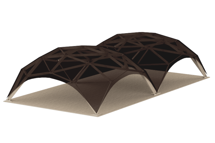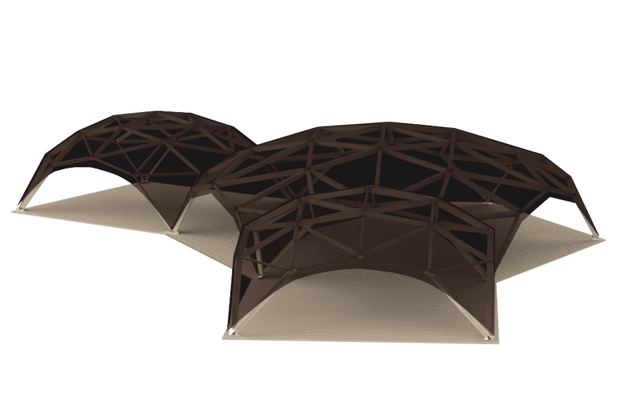 Puuteltassamme on kolme eri kokoa: 36m, 64m, 100m. Puiset teltat voidaan yhdistää toisiinsa minkä tahansa muotoisiksi hahmoiksi. Riippuvien rakenteiden kokonaispinta-ala voi olla useita satoja neliömetriä.